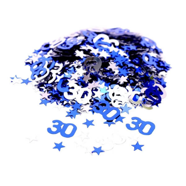 A csomagban csillagok és 30-as fényes számok vannak kék és ezüst színekben.