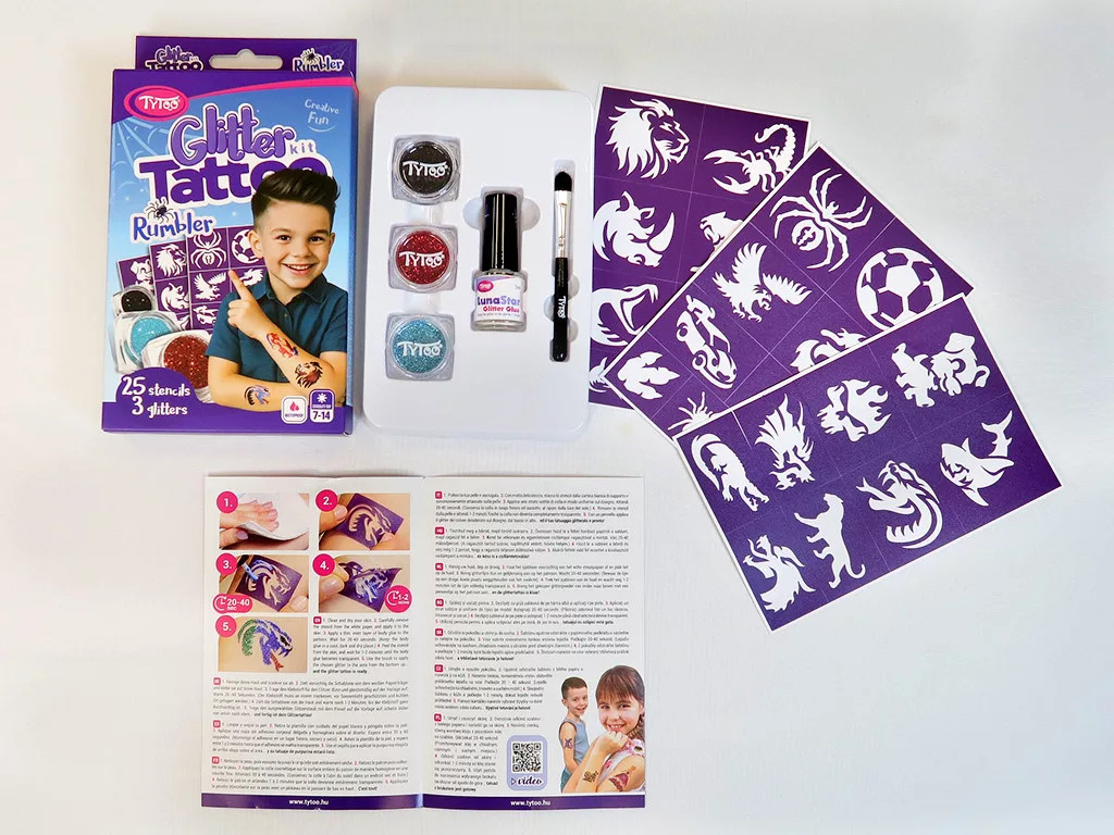 A Rumbler készlet ideális választás, ha gyerek csillámtetoválás szettet, vagány glitter tetoválást, sportos csillámtetkó készletet, vagy komplett csillámtetoválás készletet fiúknak és lányoknak keresel. A doboz minden szükséges eszközt tartalmaz, így kezdők és haladók számára is tökéletes.