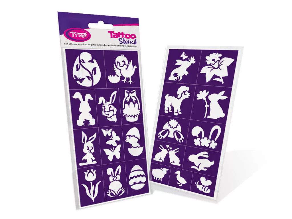 Ezzel a sablon szettel egyszerűen és látványosan tudsz te vagy akár a gyerekek is csillámtetkókat varázsolni – ráadásul húsvéti mintákkal!