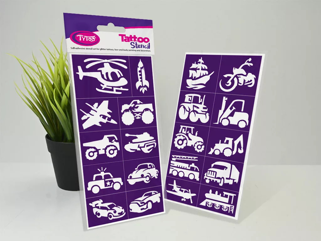 A csomagban legalább 20 különböző minta található, két nagy méretű íven (10cm x 20cm) elrendezve, így garantált a hosszú távú kreatív szórakozás. A sablonok két rétegűek, nem kell kivágni őket: egyszerűen csak le kell húzni az ívről, rásimítani a bőrre, és már indulhat is a festés vagy csillámporozás!