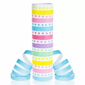 Csíkos és pöttyös, pasztell színű, papírból készült szerpentin. A tekercs 18 darab 4 m hosszú szalagot tartalmaz.